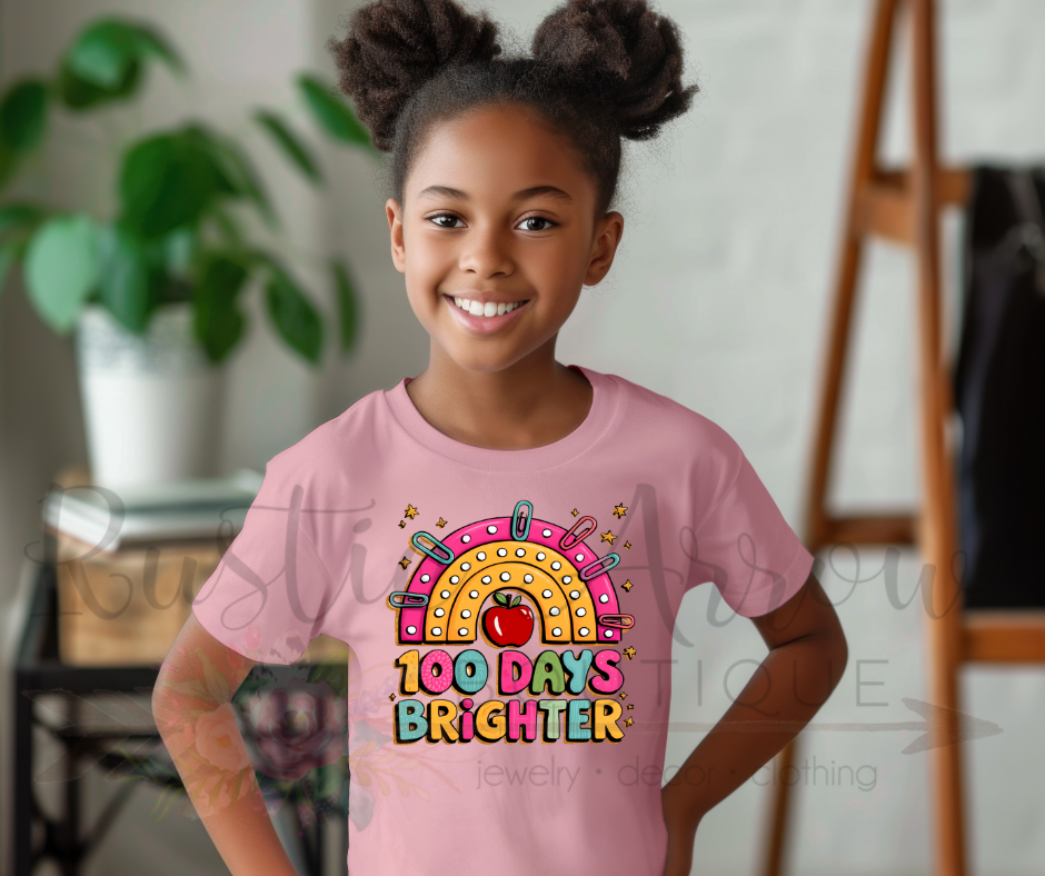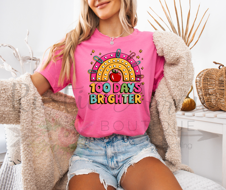 Celebrate the 100th day of school with positivity in our 100 Days Brighter T-Shirt! Featuring a bright, cheerful design, this tee is perfect for students, teachers, and anyone marking this milestone with fun and school spirit. Ideal for classroom parties, school photos, and Day 100 celebrations, it adds a burst of happiness to any outfit.