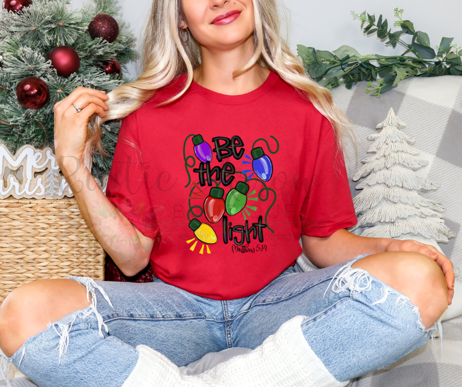 Illuminate your holiday wardrobe with our “Be the Light” T-shirt. This cheerful design features vibrant, colorful Christmas lights strung around the uplifting phrase “Be the Light,” making it a perfect reminder to spread joy and warmth during the festive season.