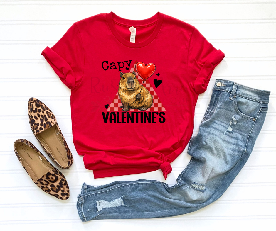 Made for capybara lovers and pun enthusiasts alike, the “Capy Valentines” shirt pairs perfectly with casual outfits, cozy date nights, and fun Valentine’s celebrations. Show off your love for the internet’s favorite chill animal in a sweet and funny way!
