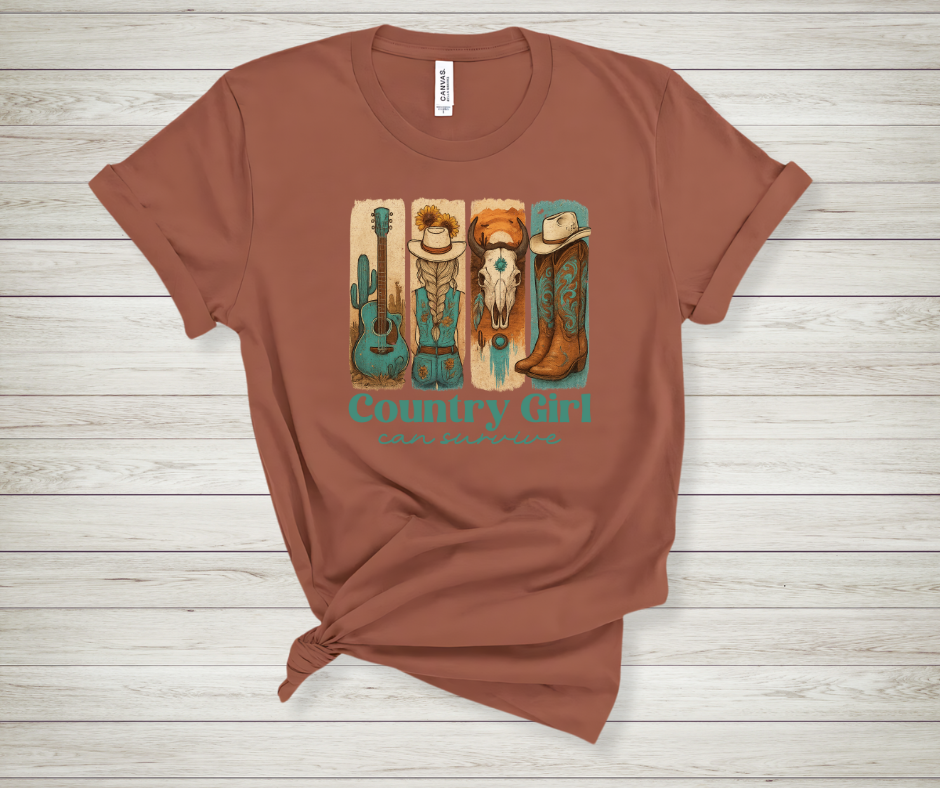 Show the world just how tough you are with our “Cowgirl Can Survive” T-shirt. Inspired by grit, independence, and true western spirit, this tee is perfect for the woman who knows her strength. With a stylish western graphic and a soft, lived-in feel, it’s the perfect blend of comfort and cowgirl attitude.
