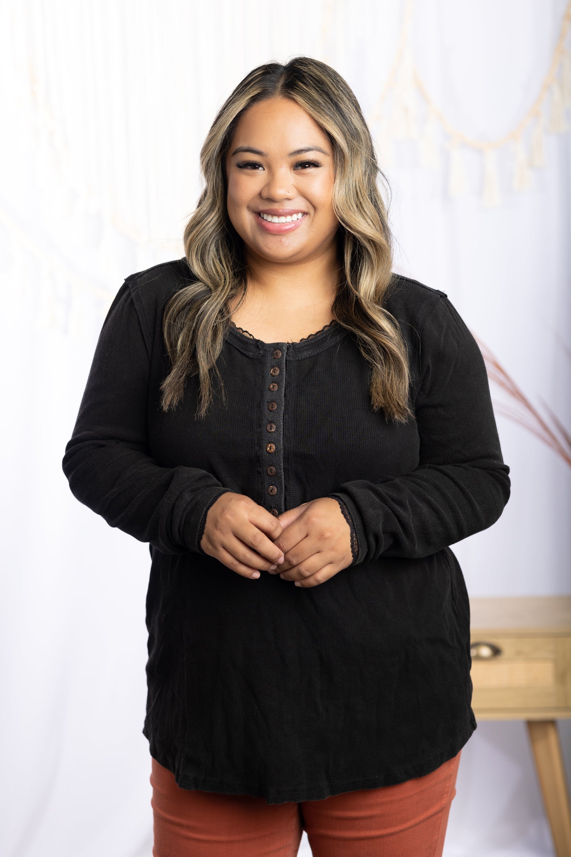 Everyone loves a henley, and this one takes the cake..it will absolutely become your forever go to piece. Made from a heavy knit fabric, this top features a scoop neck with functioning buttons, reverse stitching details and lace trim on the neck and sleeves.