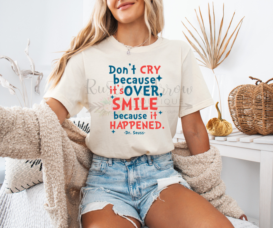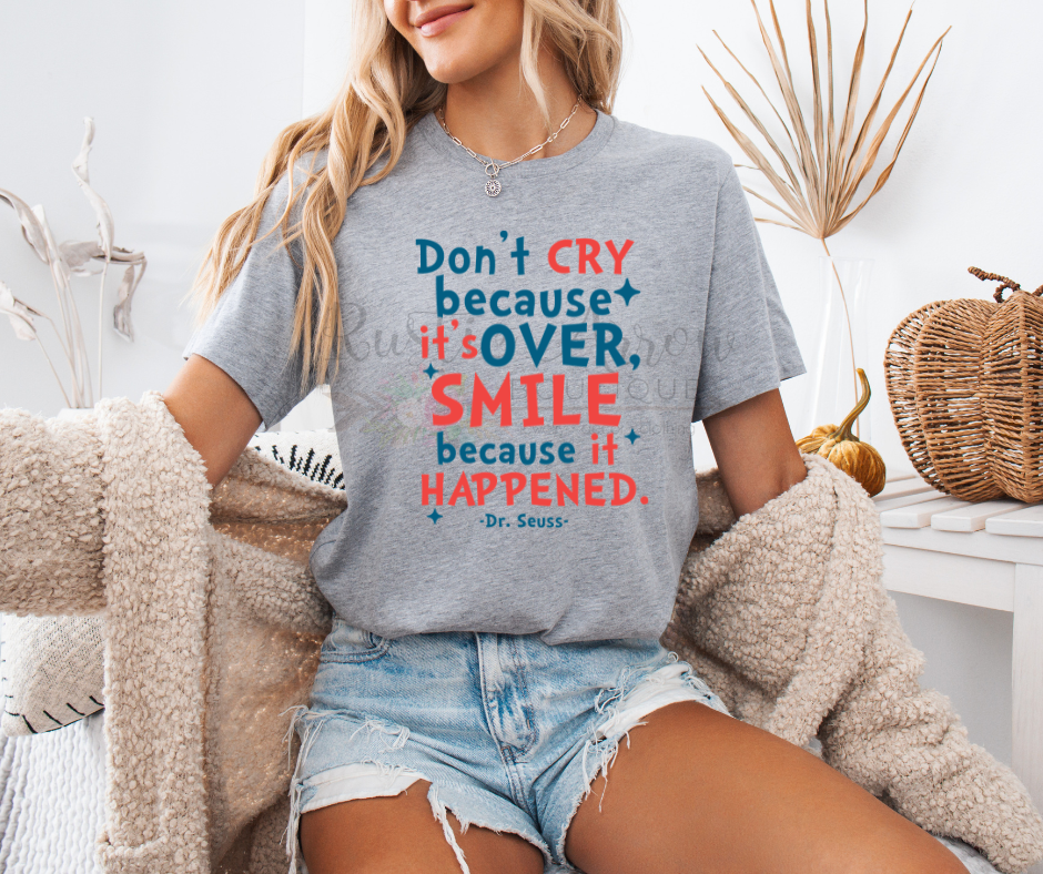 Celebrate memories, milestones, and meaningful moments with our Don’t Cry Because It’s Over, Smile Because It Happened t-shirt. This uplifting inspirational quote tee is a reminder to focus on gratitude, growth, and the joy of the journey.