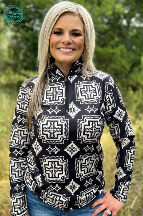 Introducing our Down In The Hills pullover, featuring a bold cream aztec design on a sleek black backdrop. Perfect for chilly adventures or cozy days at home, this pullover adds a touch of style and comfort to any outfit.