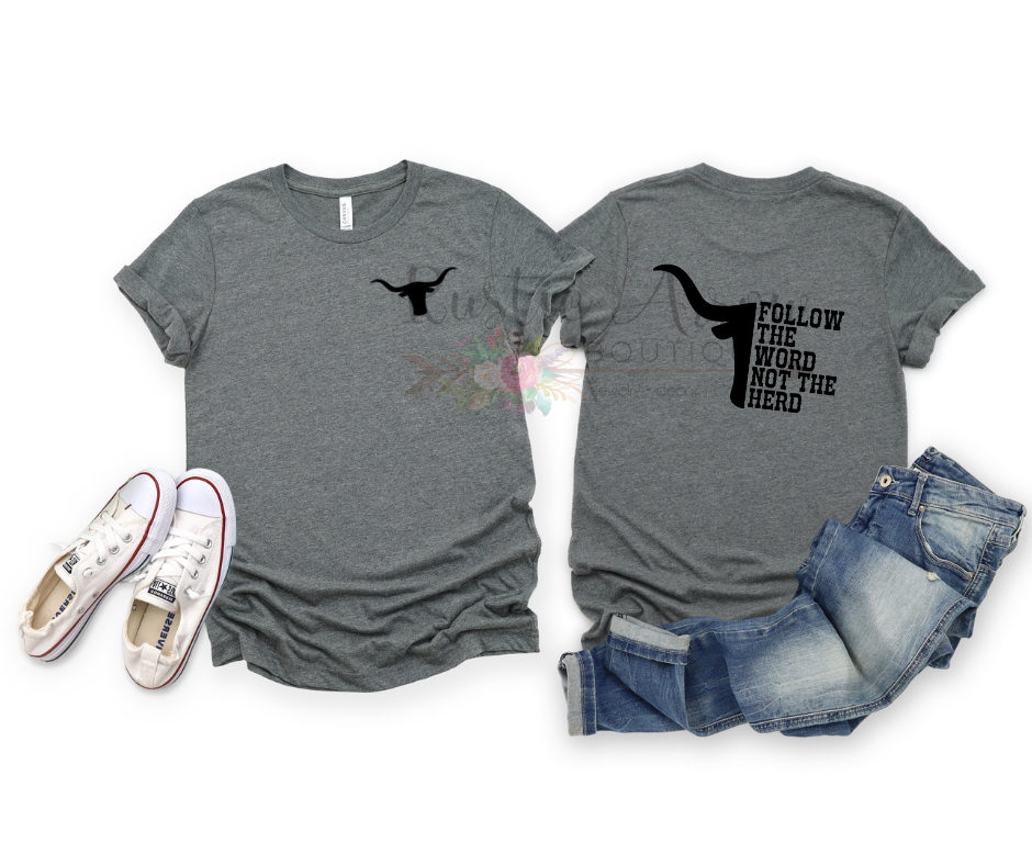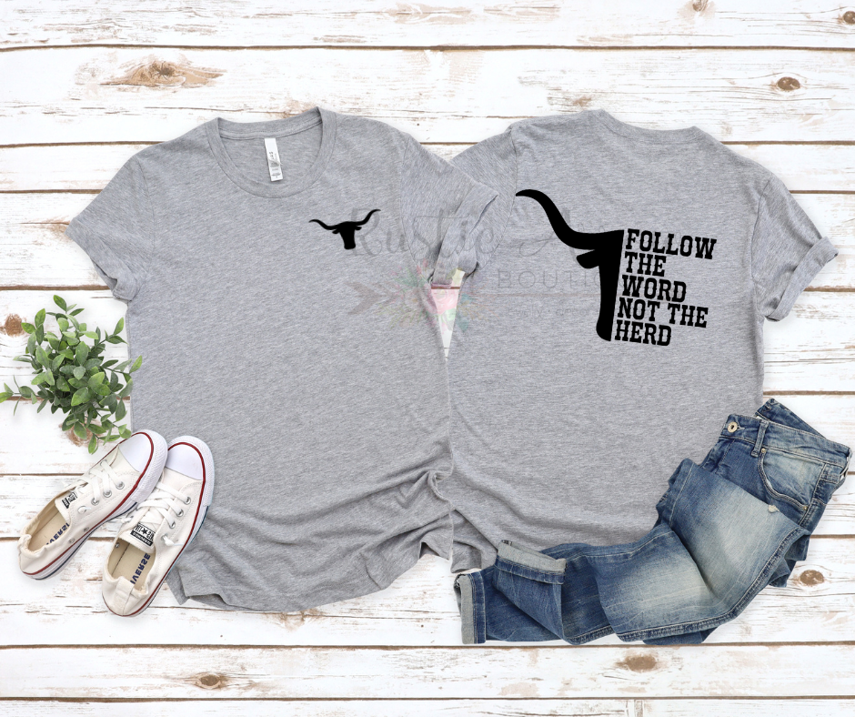 Make a bold statement of faith and individuality with our Follow the Word, Not the Herd t-shirt. Designed for those who choose conviction over conformity, this inspirational Christian graphic tee encourages you to stand firm in biblical truth rather than following the crowd.