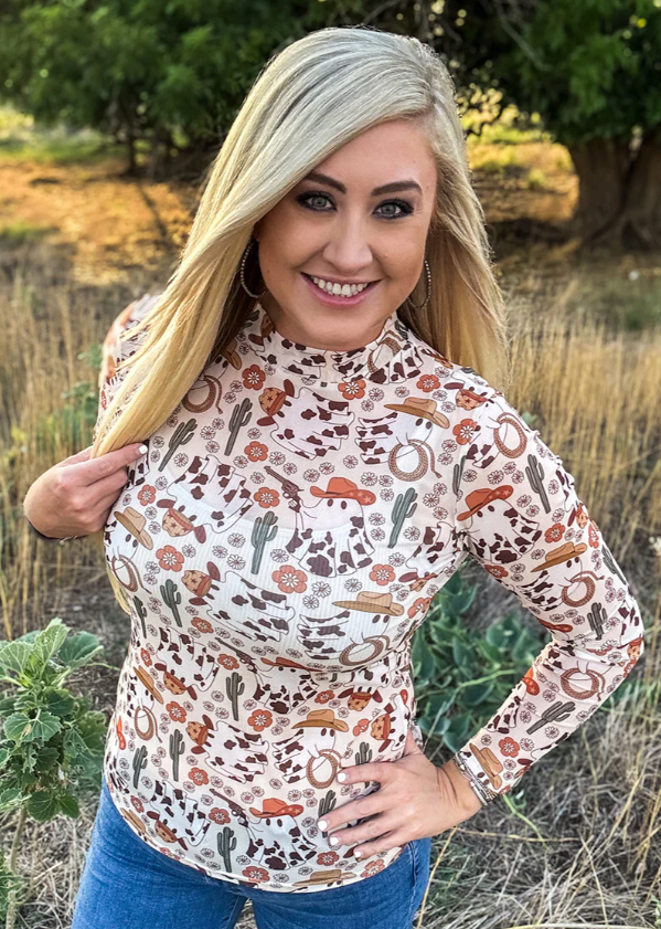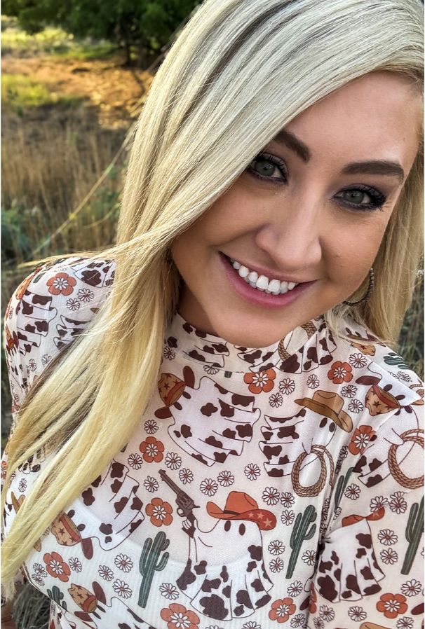 Embrace the wild spirit of the West with the Hauntin' The Range Mesh top. Featuring a unique ghost design adorned with cow prints and cowboy hats, complemented by cacti and rope details, this top blends spooky charm with rugged style. Its breathable mesh fabric ensures comfort while making a bold statement, perfect for those who want to stand out with a playful, western-inspired look.