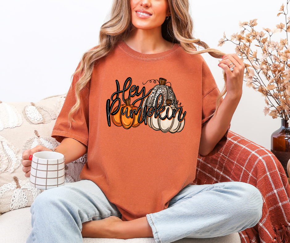 Celebrate fall with this cozy and fun “Hey Pumpkin” T-Shirt!