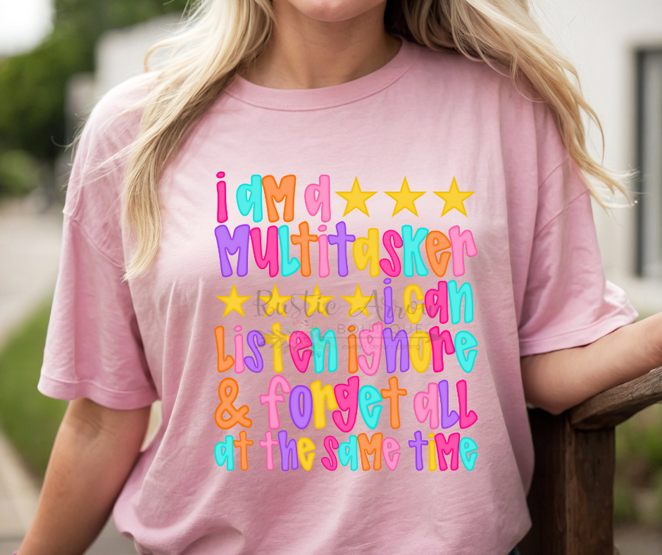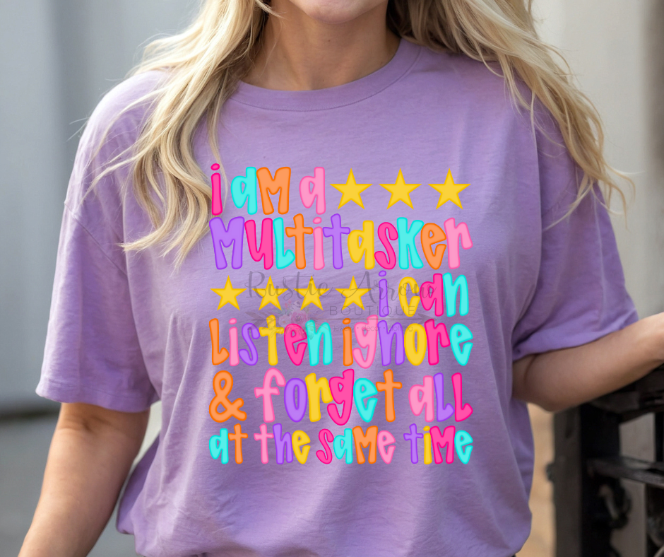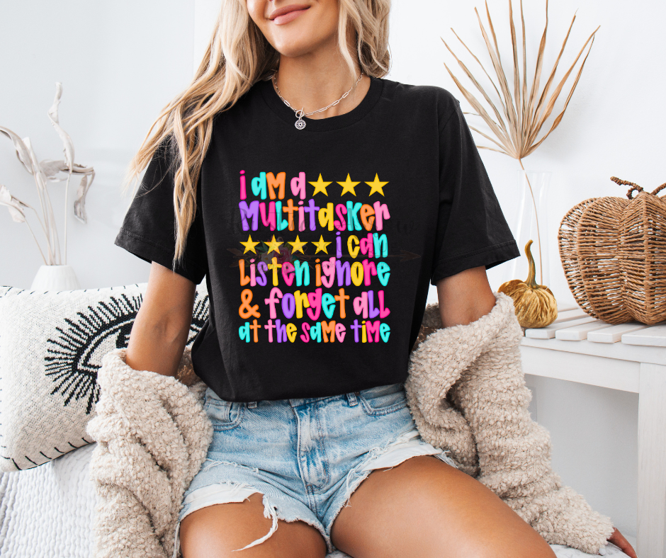 Our “I Am a Multitasker” T-Shirt is perfect for anyone who loves funny, sarcastic, and relatable apparel. Featuring the hilarious quote “I can listen, ignore, & forget at the same time”, this tee is great for teachers, coworkers, parents, or anyone with a busy life and a sense of humor.