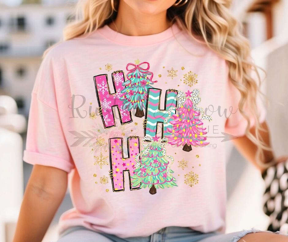 Celebrate the season in bold, cheerful style with our “Pink HO HO HO” T-shirt. Featuring a vibrant pink design and classic holiday message, this tee adds a playful, feminine twist to traditional Christmas apparel.