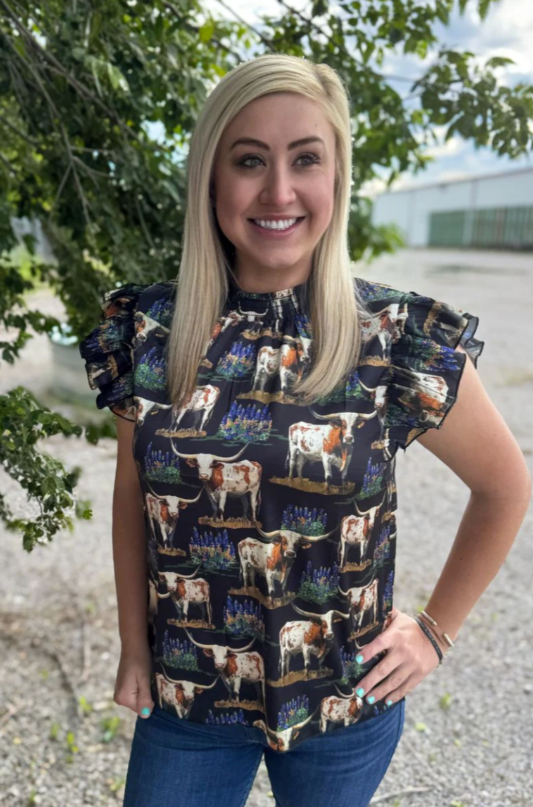 Embrace Texas charm with our "Somewhere In Texas Top"! This adorable blouse features sweet ruffled short sleeves and a playful pattern of bluebonnets and longhorns that celebrates Lone Star pride. Stylishly elegant yet wonderfully comfortable, it's the perfect addition to your wardrobe for showing off your Texas spirit with a touch of feminine flair.