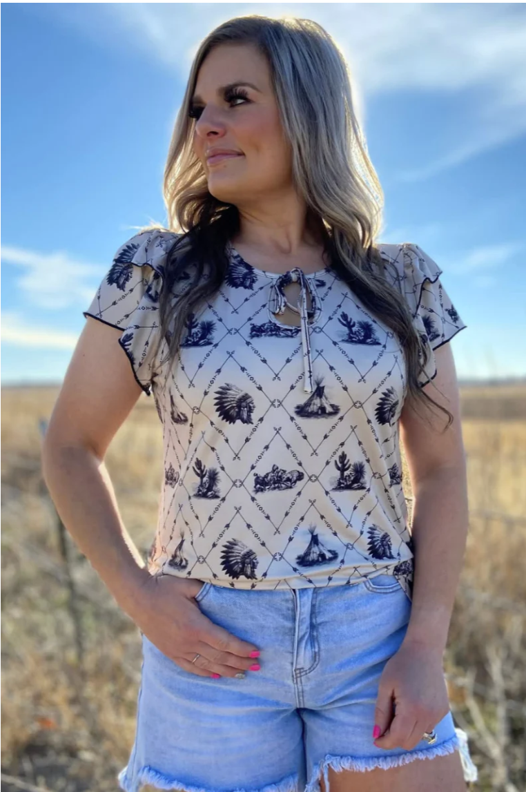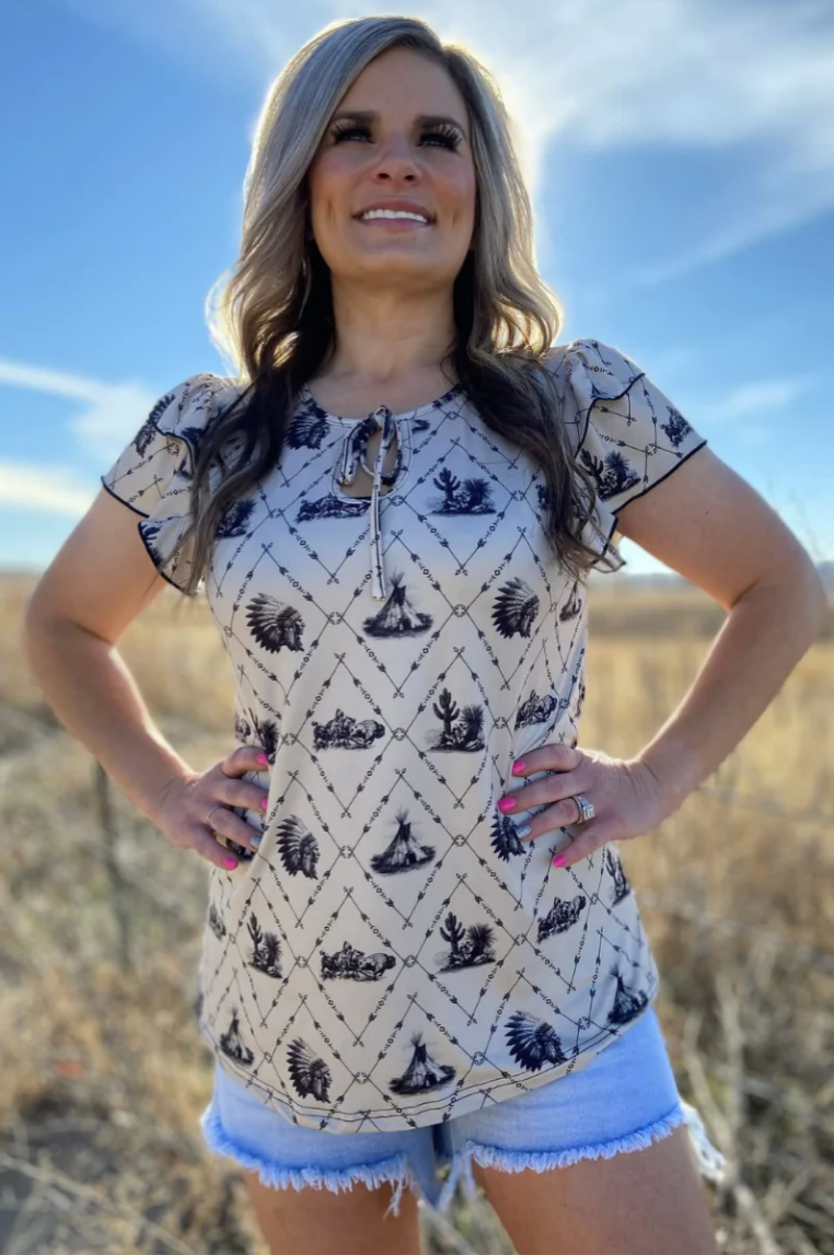 This short sleeve ruffle top showcases a stunning southwestern pattern with a charming bow accent. The delicate ruffled sleeves frame the shoulders beautifully, while the bold geometric design draws inspiration from desert landscapes and traditional southwestern aesthetics. Lightweight and comfortable, it's ideal for warm weather styling with your favorite bottoms. Layer it over a camisole or wear it solo for an effortless, bohemian-inspired look that transitions seamlessly from day to night.