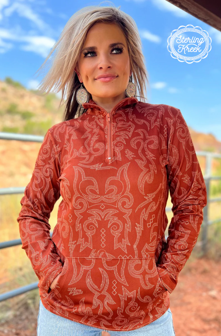 Stay cozy and stylish with The Rustic Ranch Pullover! This burnt orange pullover features a convenient hoodie pocket and a unique cream boot stitch design. Perfect for keeping warm on those chilly days with a touch of rustic charm. (Yeehaw, this pullover is a must-have for any rancher or fashionista!)