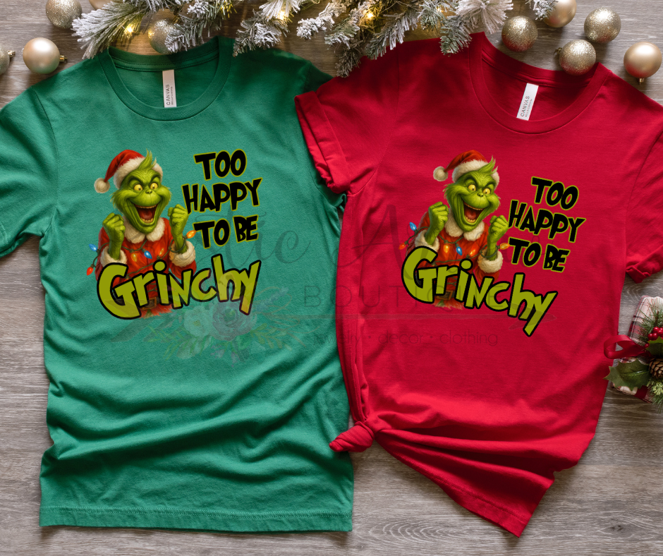 Spread holiday cheer with our 'Too Happy to be Grinchy' T-shirts! Perfect for Christmas parties, festive outings, or cozy holiday lounging, these fun and comfy tees let everyone know your cheerful, Grinch-free spirit. A must-have for holiday lovers and gift-givers alike!