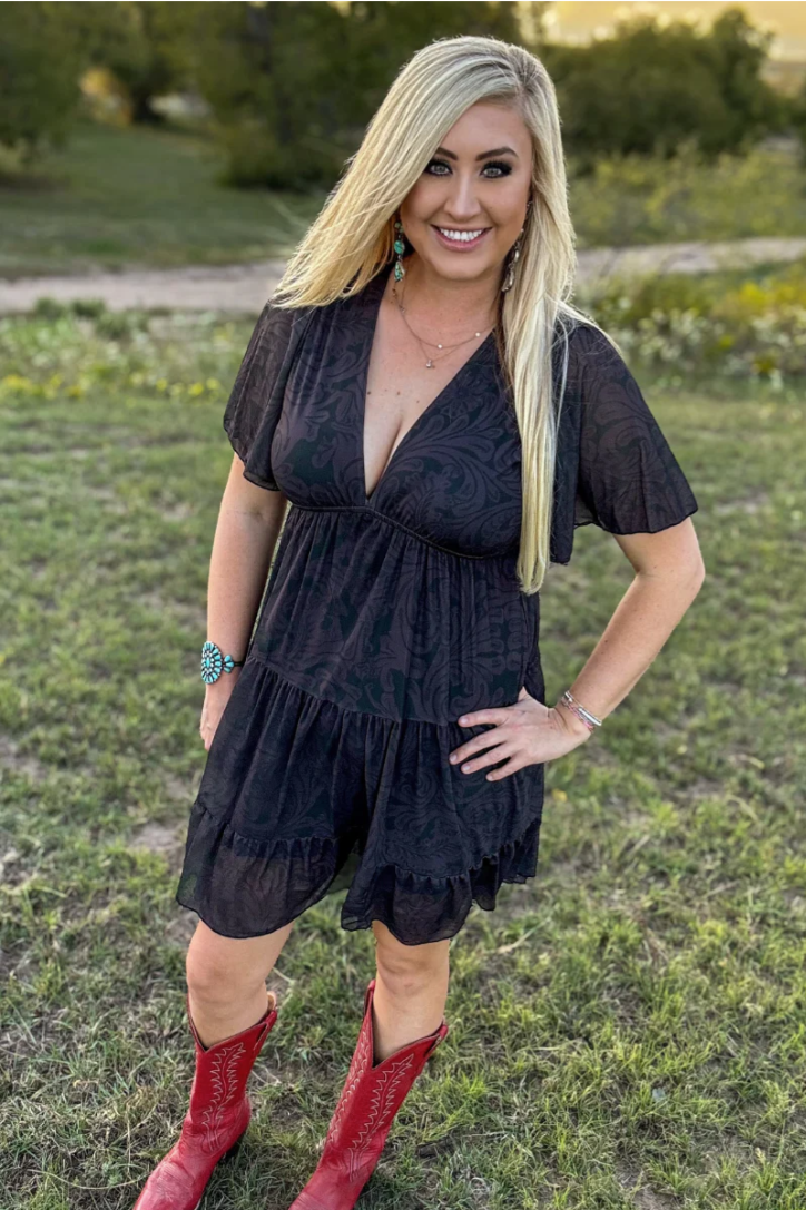 Elevate your wardrobe with the Tooled In Black Dress, featuring a sophisticated black tooled pattern. This elegant dress offers a timeless silhouette perfect for any occasion, ensuring you stand out effortlessly with its unique design. Feel confident and chic wherever you go in this flawless blend of classic style and modern detail.